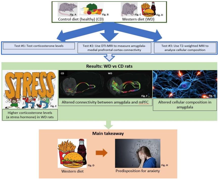 In the study, thirty-six 3-week-old rats were split into two equal groups and fed either a high-fat Western diet (41% fat) and allowed to become obese or a healthy control diet (13% fat) for 9 weeks. Rats then underwent a 2 day “stress program” to simulate exposure to traumatic events (e.g. electric shocks, loud noises). Post-mortem T2-MRI and DTI-MRI scans were obtained from the WD and CD groups, which provide information regarding cellular composition and connective pathways, respectively. Also, rat feces were collected at three points during the experiment and analyzed for corticosterone, which is a stress hormone similar to cortisol in humans.9